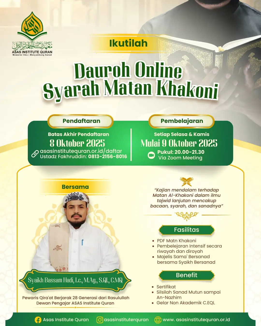 Daftarkan diri Anda sekarang untuk menguasai Matn Khakoni dan dapatkan sanad otentik langsung dari Syaikh.Ini adalah kesempatan yang sangat baik. Jadikan diri Anda bagian dari mata rantai keilmuan yang mulia.