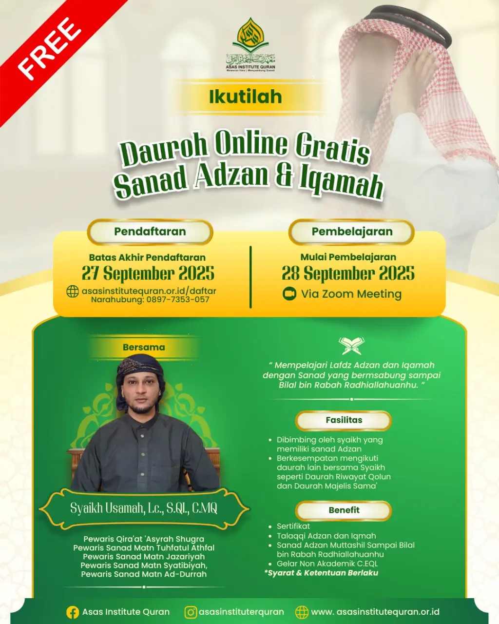 Sebuah kesempatan langka untuk mempelajari lafadz adzan dan iqamah otentik, dibimbing langsung oleh Syaikh pewaris sanad qira’at dan matan-matan tajwid.