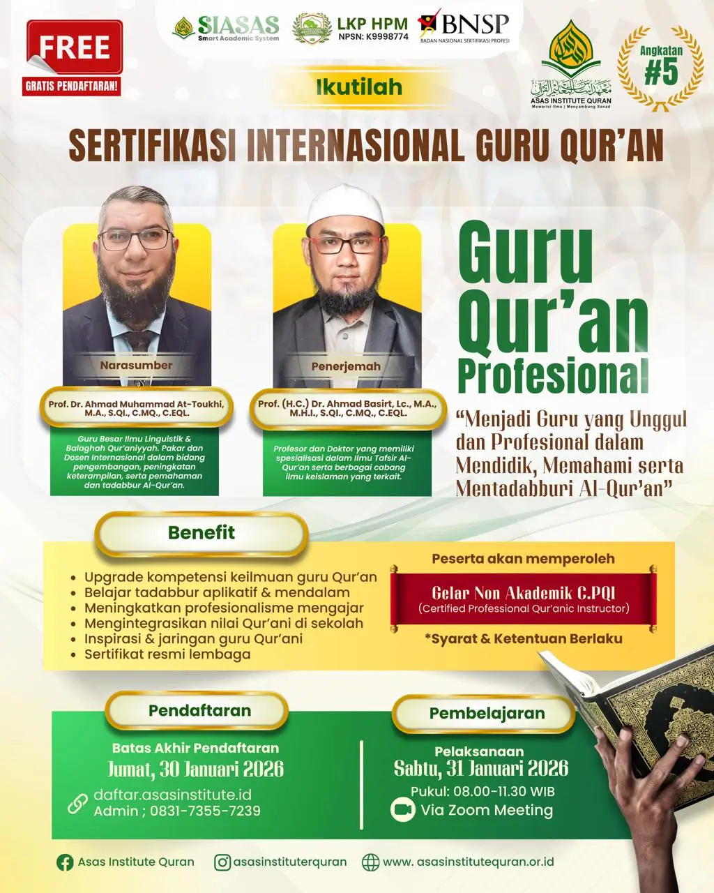 Pendaftaran akan segera ditutup pada Jumat, 30 Januari 2026. Ambil kesempatan emas ini dan jadilah bagian dari guru Qur’an profesional yang menginspirasi generasi.